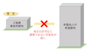 また、当社も弁護士さんなど、いろいろなところに相談しましたが、仮に土地売買を裁判所への非訟手続きによる代諾許可で進められたとしても、建物建て替えの代諾許可は得られない可能性があるという結論に至りました。上記の2つの理由による譲渡承諾・建替え承諾の拒否がある程度合理的だという判断になる可能性があるのと、もともと現状でも契約書でも2階建ての建物建築を目的として借地権が設定されているため、あまりにそれとかけ離れた建物建築は、土地所有者の承諾なしに許可できないという結論になる可能性があるとのことでした。